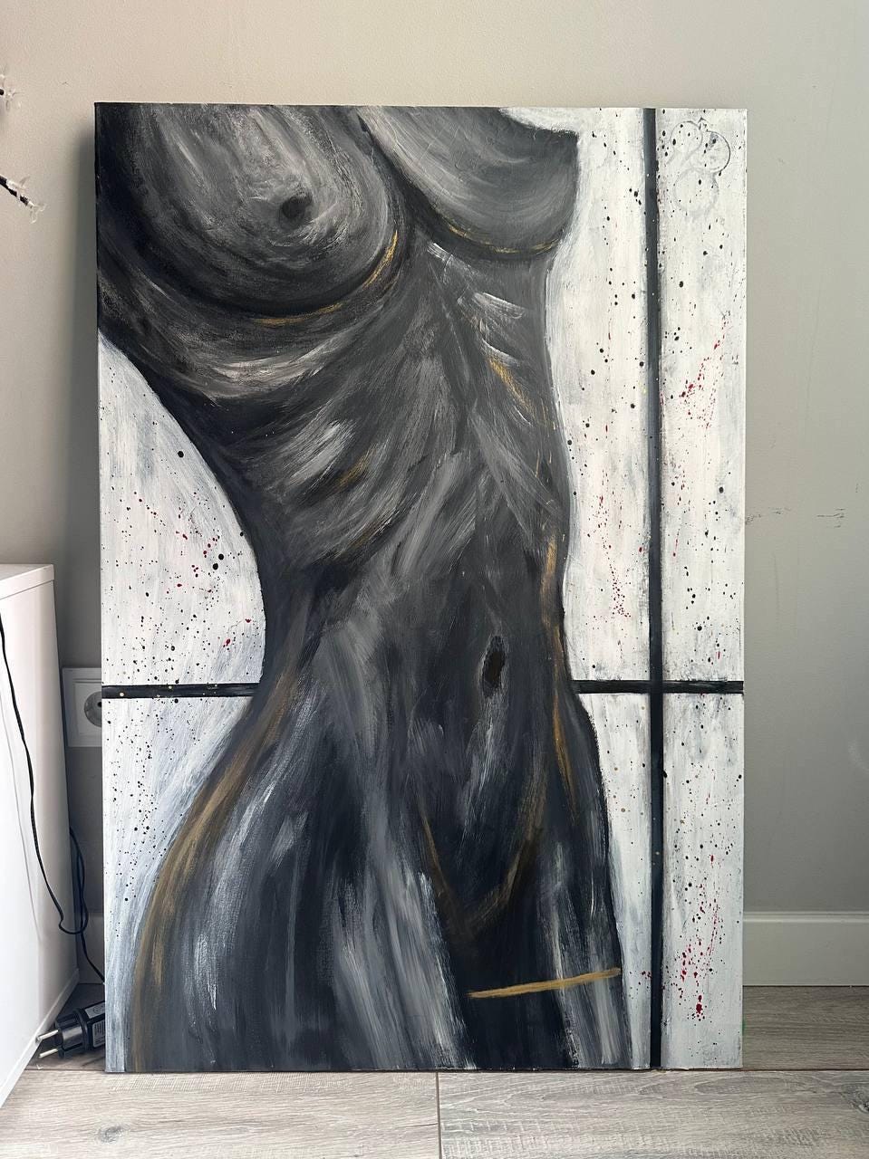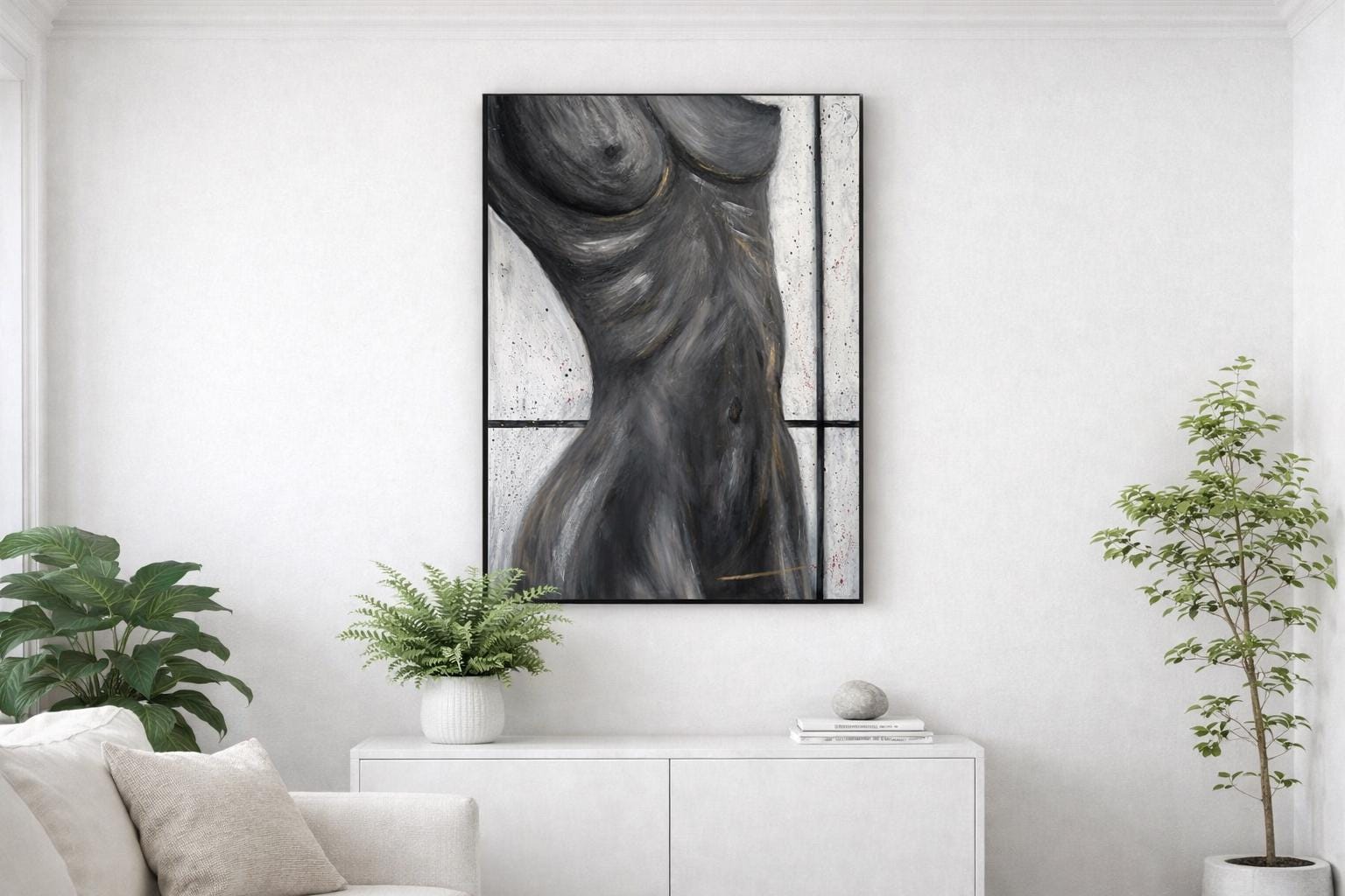 Is an original abstract figurative oil painting that explores strength, vulnerability, and balance through the female silhouette. The composition focuses on movement and structure rather than explicit detail, allowing the viewer to interpret the form emotionally rather than literally.