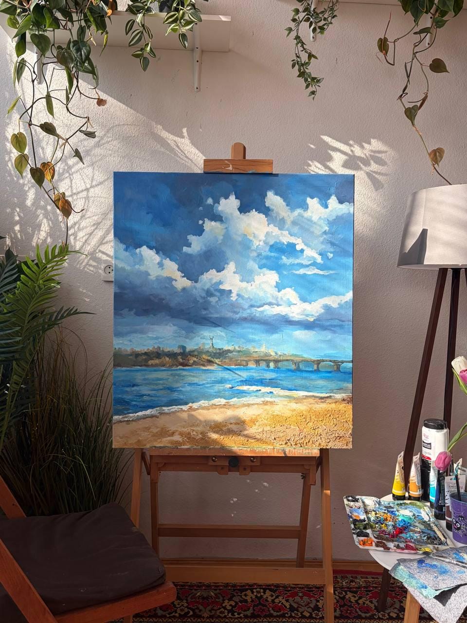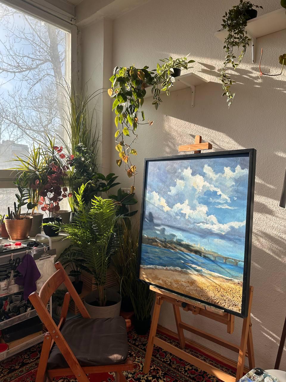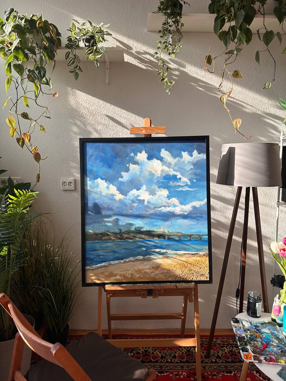 The painting is created with acrylic using texture paste and real sand taken from the very beach that inspired the landscape. The artwork also comes with a photograph of the place and a small amount of Kyiv sand to create the feeling of truly being at the location where the scene was captured. The exact coordinates of the place where the sand was collected will also be included.